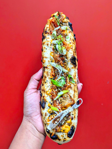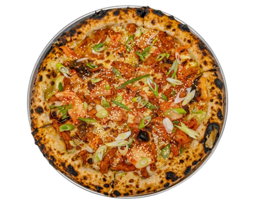 White sauce, mozzarella, spicy chicken/soya, kimchi, hot honey, scallions, sesame seeds