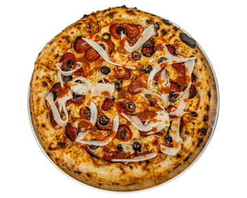 Tomato sauce, mozzarella, pepperoni, pepperoncini, olives, 'nduja, oregano