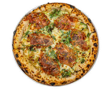 White Sauce, arugula, mozzarella, prosciutto, pistachio gremolata, citrus honey
